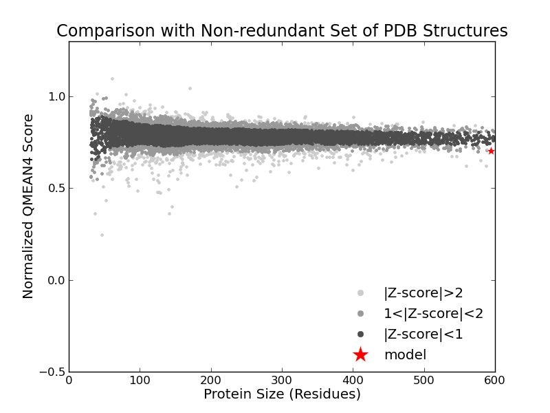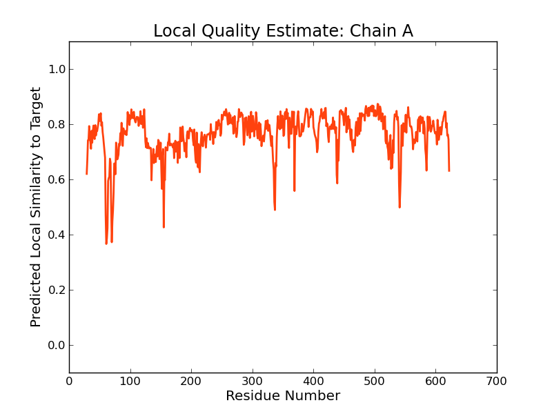 The global and per-residue model quality has been assessed using the QMEAN scoring function (Benkert et al.) . For improved performance, weights of the individual QMEAN terms have been trained specifically for SWISS-MODEL.